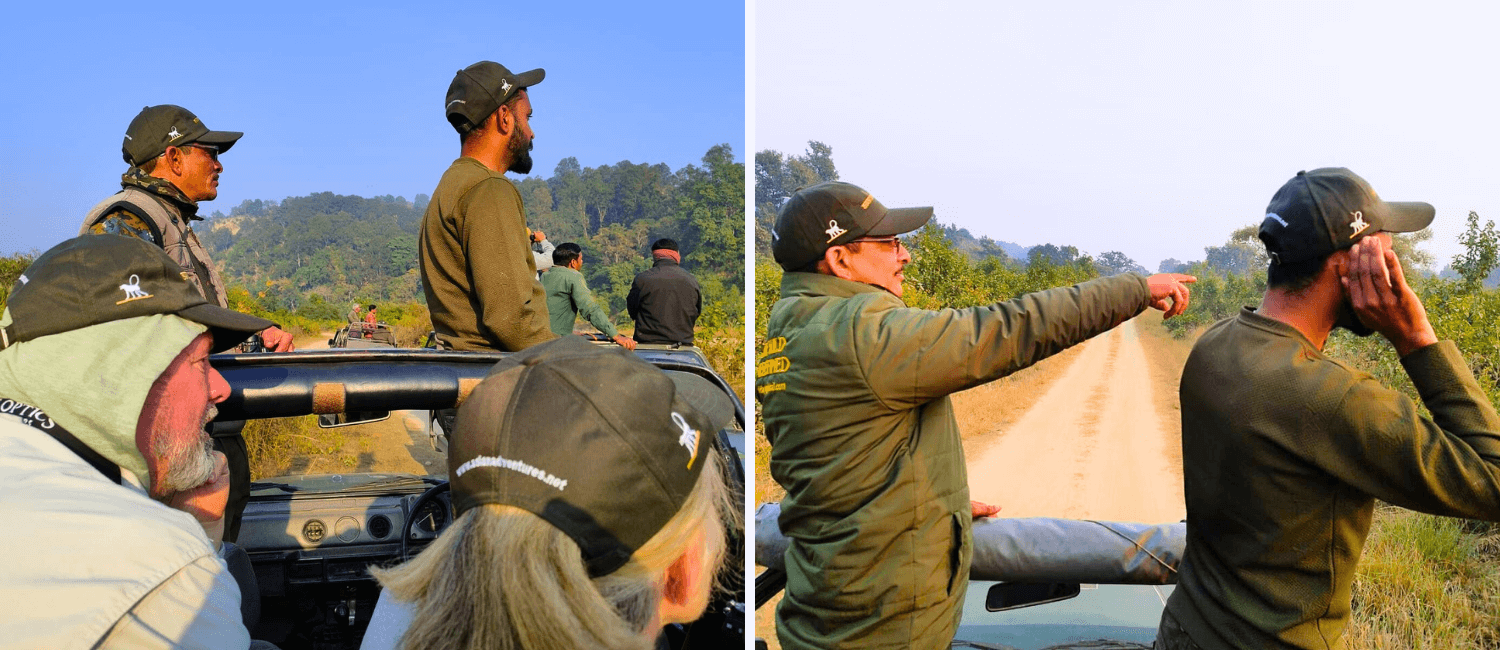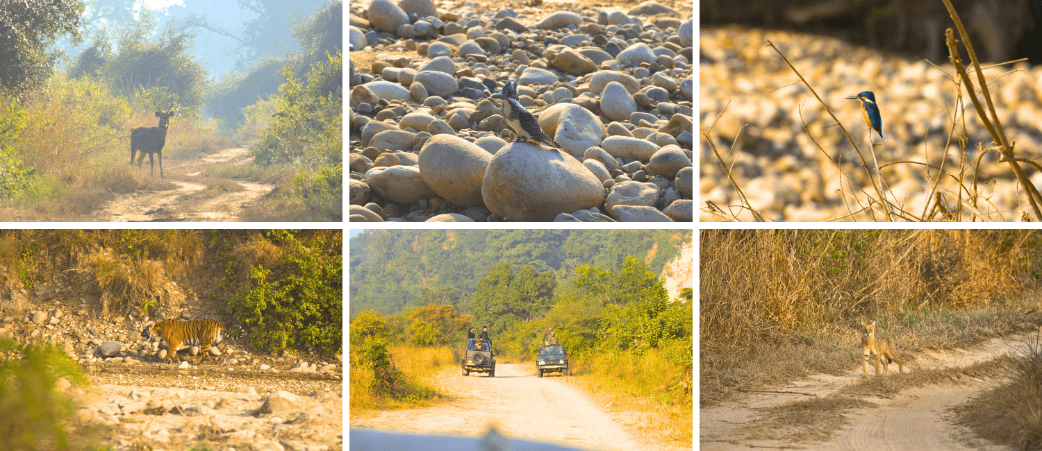 The morning safari in Garjiya Zone turned magical. Fresh tiger pugmarks and spotted deer calls kept us alert. Near Baba Nala, a sambhar deer alarm confirmed what we were hoping for.