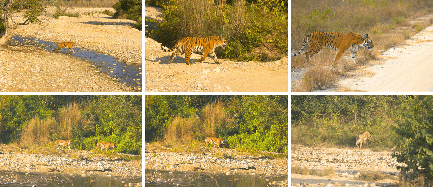 The evening safari in the Jhirna Zone changed the mood completely. Around 4:30 PM, we received news that a tigress had crossed the High Bank (Number 4). Following the fresh tracks, we positioned ourselves carefully—and suddenly, a tiger walked straight across in front of our jeep.