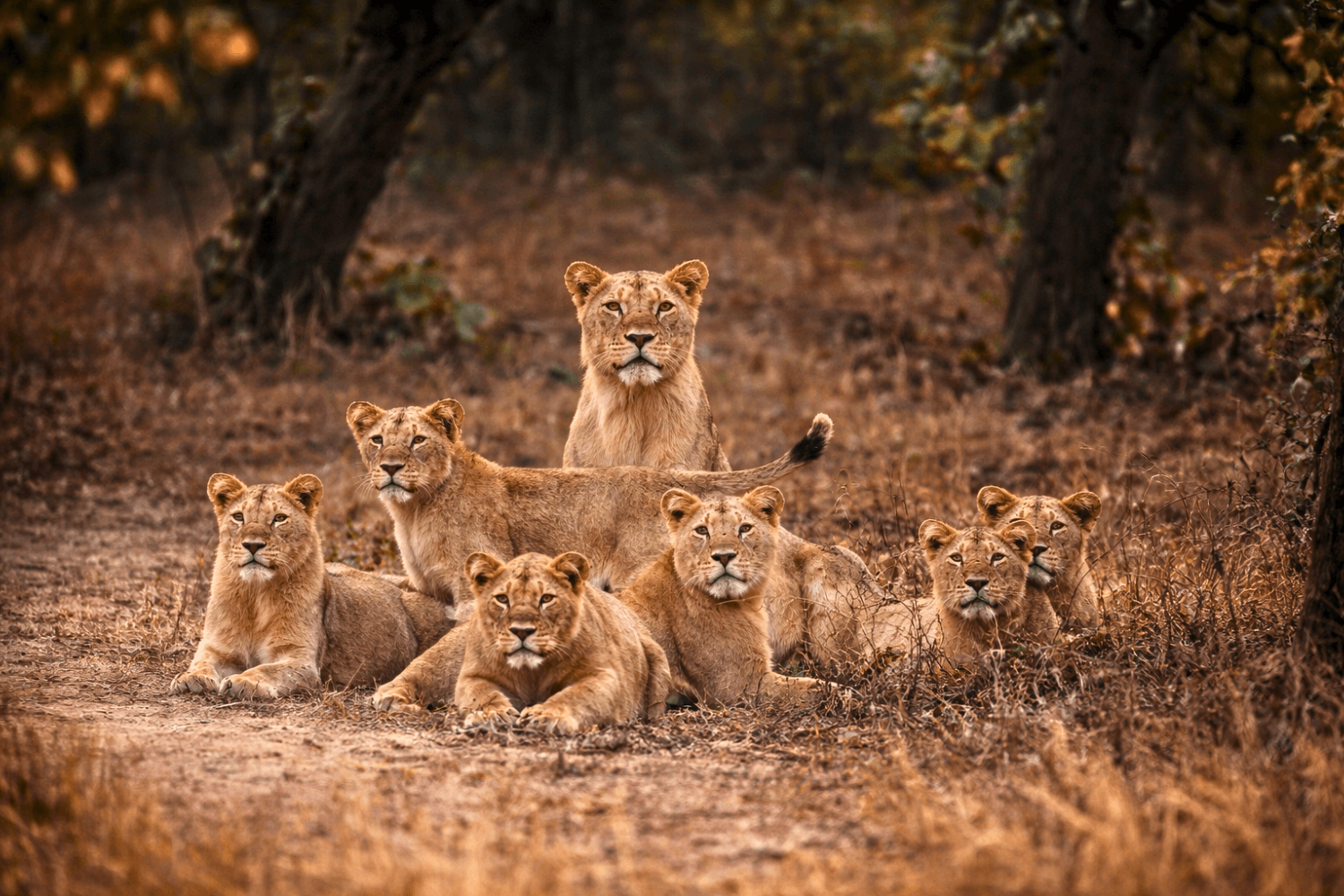 Gir National Park was established in 1965 for the protection of the Asiatic Lion. The forest is mainly of dry deciduous and scrubs types, with many perennial rivers and streams crisscrossing the area. The wildlife of Gir includes large predators such as Asiatic Lion and Leopard, herbivores such as Spotted Deer, Sambar, and Nilgai, a variety of bird species, and more.